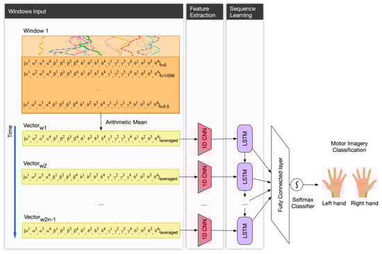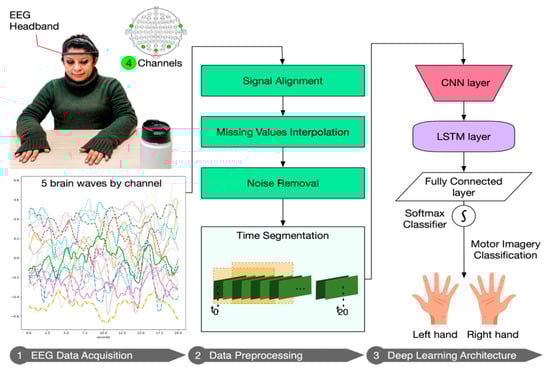 This section describes the workflow of our DL pipeline which consists of three main steps: (1) EEG data acquisition; (2) Data preprocessing; and (3) DL architecture for building a model to classify two imagery movement intentions. Figure 4 presents the pipeline which will be explained in detail in the next subsections.