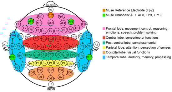 We used a Muse headband (version 2) by InteraXon [5], an EEG wearable device with 4 electrodes (channels) which can detect brain signals in a low-intrusive way. This device records EEG using 4 gold-plated cup bipolar electrodes, which are located on the frontal and temporal brain areas. Figure 5 shows (in light green) the location of the electrodes that follows the 10–20 international standard and the brain areas covered. These active electrodes (or channels) are: TP9 (left ear), TP10 (right ear), AF7 (left forehead), AF8 (right forehead) for average sized heads. The frontal electrodes could be placed in the location of F7 and F8 electrodes for small sized heads as Li et al. [26] mentioned. The reference electrode in Muse is Fpz. It does not capture brain signals, but measures the potential differences (voltage) between the active electrodes and Fpz.