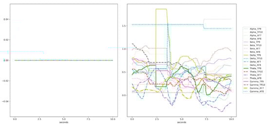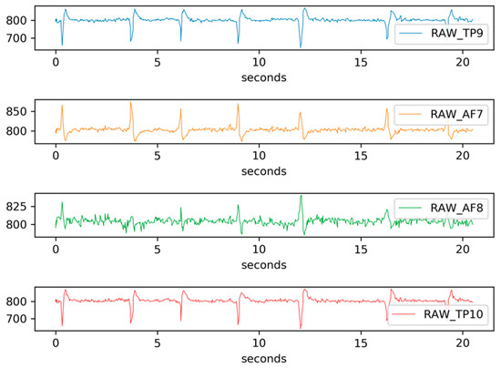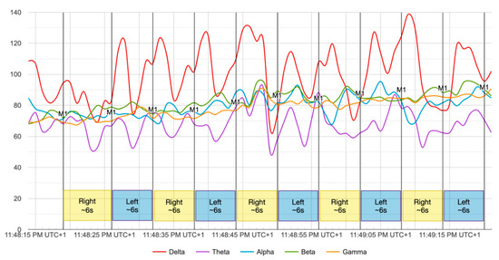 In the headband, each channel (TP9, TP10, AF7, and AF8) captures a raw EEG signal, measured in microvolts (μV). Thus, we have four raw EEG signal data in total. These raw data consist of 4 signals coming from the 4 channels and they are ranging from 0 to 1682 μV approximately (see a signal sample in Figure 6, ranging from 600 to 800 μV). The Mind Monitor app supports collecting the five common brain waves, or frequency bands (α, β, δ, γ, and θ) and applies a notch filter of 50 Hz to delete electrical power interferences. This app automatically processes the raw data coming from each channel to obtain the brain waves, using the logarithm of the power spectral density (PSD). In ascending order, the frequency bands obtained are: (1) delta (<4 Hz, common in continuous-attention tasks), (2) theta (between 4 and 7 Hz, appears in repressing a response or action), (3) alpha (between 8 and 15 Hz, spikes when relaxing or closing eyes), (4) beta (between 16 and 31 Hz, displays active thinking, focus, high alert, or anxiety), and (5) gamma (>32 Hz, reflects cross-modal sensory processing). Figure 7 shows these 5 waves per each of the 4 channels (in total 20 signals) for left and right hand motor imagery. Furthermore, the headband also records other signals such as accelerometer, heart rate, breath, and muscle movement sensors (allowing to record blinking and jaw clenching). Although, some of these sensors are neither supported for developers nor by the Mind Monitor app.