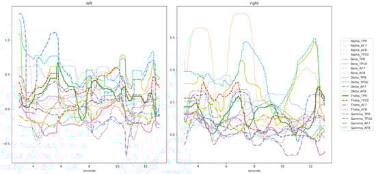 Sample of a participant’s EEG signal for the five waves per channel. The left figure shows the brain waves for left-hand motor imagery and the right figure shows the brain waves for right hand motor imagery.