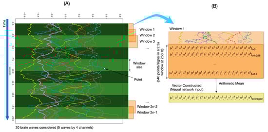 Construction of vector windowed input for a 20-session size applying 50% overlapping of sliding windows. (A) Data from one participant with the 20 brain waves (5 waves per each of the 4 channels—AF7, AF8, TP9 and TP10) before segmentation in windows. (B) Detailed vector values of a single window and the final vector, calculated as the arithmetic mean of the window vectors.