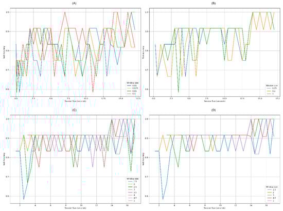 Test accuracy curves for different window sizes. (A) Unstable accuracies for very little window sizes. (B) Stable accuracies from 6.5 s session size. (C) Some stable window sizes from 4 s session size. (D) Best stable window sizes between 2 and 4 s of session size.