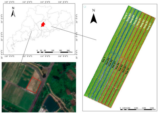 The experimental area is located at the teaching and research base of South China Agricultural University in Zengcheng, China (23°09 N, 113°22′ E; altitude: 11 m). The area is characterized by a subtropical monsoon climate, with 1945 annual sunshine hours, an annual average temperature of 20–22 °C, and 1623.6–1899.8 mm of annual precipitation.