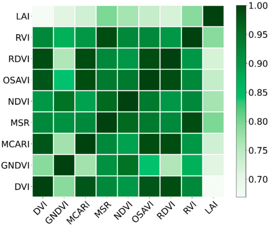 Based on the above correlation analysis, eight VIs were selected: DVI, GNDVI, MCARI, MSR, NDVI, OSAVI, RDVI, and RVI. A correlation heat map of the VIs and the whole growth period was produced (Figure 3) and shows that MSR, NDVI, and RVI had the strongest correlations with LAI throughout the reproductive period (0.796, 0.767, and 0.789, respectively).