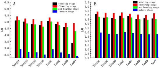 LAI for two peanut varieties under single sowing (A), and LAI for two peanut varieties under double sowing (B).