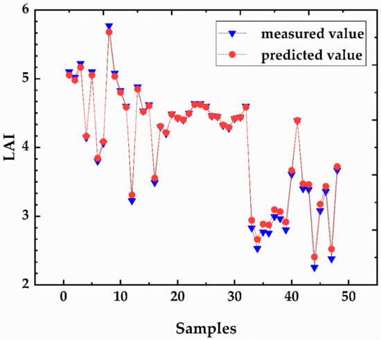 In this study, the number of implicit layer neurons was set to 10, according to Equation (4). The training results are shown in Table 5, and the accuracy of the S-BPN models was mostly <0.9 (only the NDVI-BPN and RVI-BPN models had prediction accuracies >0.9). The C-BPN model predicts much better than the S-BPN models, reaching 0.968. Figure 6 compares the training results of the C-BPN model with the measured LAI values; the C-BPN predictions were very close to the observed values, suggesting good predictive ability.