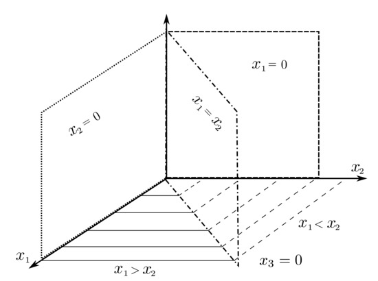 From Figure 1, it can be noticed that the level in the third tank only depends on the output flow of the second Tank . Therefore, the complete system can be seen as the interconnection of two systems in cascade: two interacting tanks and the lower tank. Hence, the phase portrait is used in order to analyze the behaviour of the two interacting Tanks and . To this end, , , and . Referring to Figure 2, and , respectively, denote regions where the level in is greater than that of , the level in is lower than in and the levels in Tanks and are equal.