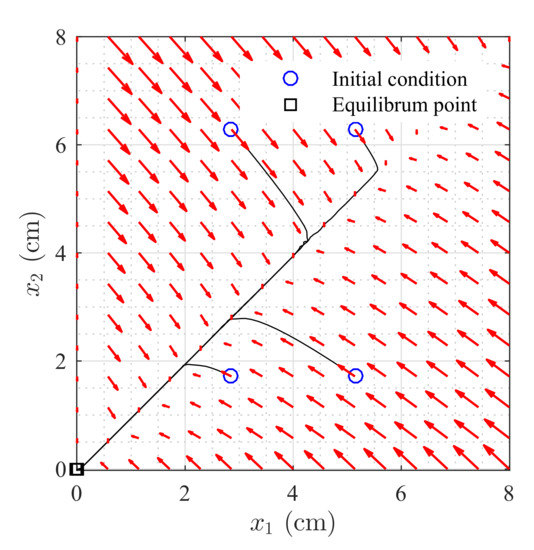 Figure 3 shows the phase portrait of the levels in Tanks and without the input. As it is shown, trajectories starting from different initial conditions in the regions and approach the equilibrium point (origin). Nevertheless, this depends on the value of , since a large value correspond to almost zero restriction between the two tanks, transforming the two tanks into a single one.