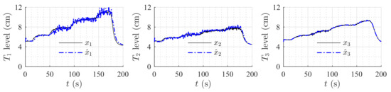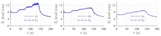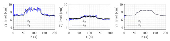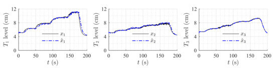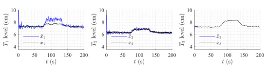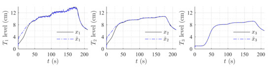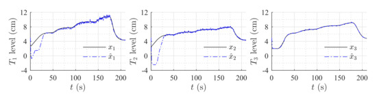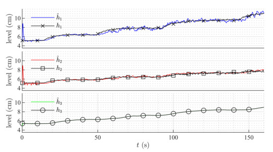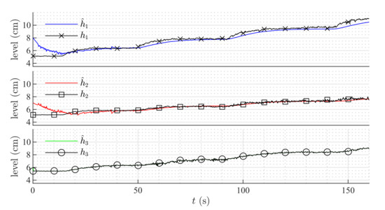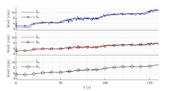 Since the real plant is a complete experimental station, all variables were measured with real sensors, as indicated in Figure 1; hence, the state estimation can be compared to real measurements of the levels in all the tanks. The sample time for the PLC and LabVIEW® program was set to . As in simulations, step inputs of 25% of the total flow capacity were manually performed every 50 approximately. The gain was again chosen such that is Hurwitz and as the high-gain observer parameter. Two different sets of weirs were used at the outputs of Tanks and . The first set comprised a rectangular weir in the upper tank and a linear in the lower, and the second set comprised a v-notch weir in the upper tank and a circular in the lower one.