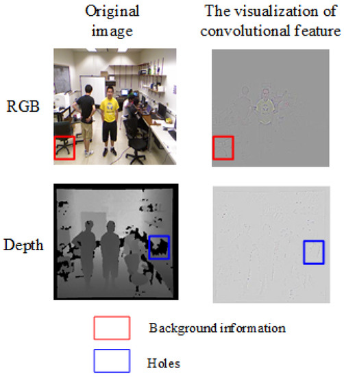 In addition, some background information is included in the RGB feature. The depth feature has some holes due to the depth camera’s sampled images. This will infect the quality of the convolutional feature. Figure 1 shows the visualization of the convolutional feature.