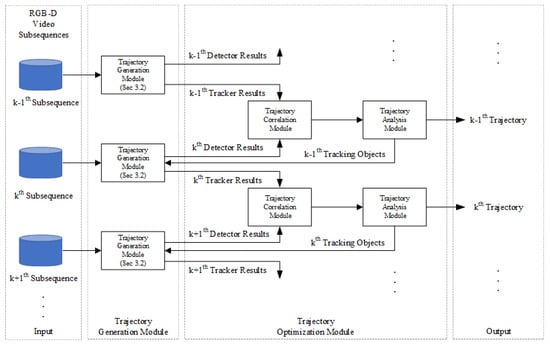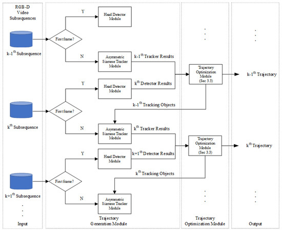 In order to solve the problems of existing MOT algorithms, we propose a tracking algorithm based on RGB-D images. This algorithm mainly includes a video slicing module, a Trajectory Generation Module (TGM), and a Trajectory Optimization Module (TOM). Figure 2 shows the overall flow chart of the tracking algorithm.