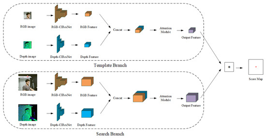 The RGB image and the depth image contain different information, where the RGB image contains the rich head appearance feature and the depth image contains the robust 3D position information. According to the characteristic of the RGB and depth image, we design the asymmetric Siamese tracker module based on the the SiamFC [42] tracker and the CIResNetnetwork structure [43] to acquire the high-quality feature from the RGB image and the depth image. Meanwhile, we import the attention module to reduce the redundant information from the RGB-D feature. The network structure of the asymmetric Siamese tracker module is shown in Figure 5.