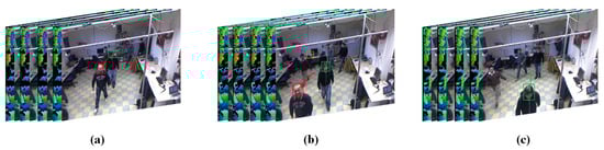 As shown in Figure 4, in the RGB image, Person A and Person B have similar facial, hair color, and another head appearance feature. Furthermore, the locations of Person A and Person B are close, and there is little difference in the motion information of Person A and Person B, which is calculated in the time-series contextual information from the RGB image. The depth image reflects directly the distance information of Person A and Person B from the scene. However, the depth image does not contain appearance information about the human head, and it is impossible to mark the target’s identity information.