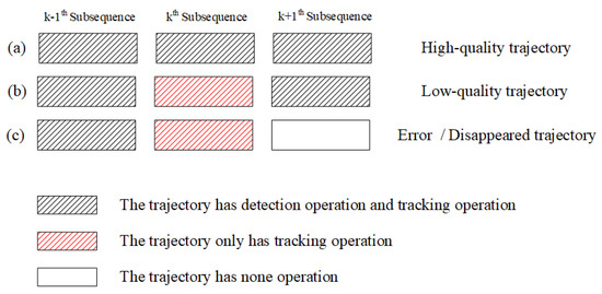 In particular, the high-quality trajectory can obtain a successful correlation result in the trajectory correlation module of each video subsequence. The low-quality trajectory often fails to obtain a successful correlation result in the trajectory correlation module of a video subsequence because the head detection module misses the head target in the scene. The error/disappeared trajectory fails to obtain a successful correlation result in the trajectory correlation module in neighboring video sequences because the people move out of the scene or the head detection module outputs the wrong results. Based on the different characteristics of the above three categories of the trajectory, we design a trajectory analysis module based on the correlation results of the trajectory correlation module.