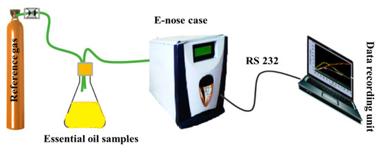 The electronic nose (e-nose) is a device that integrates a group of gas sensors with partial specificity and an adequate pattern recognition system, able to recognize both simple and complex odors [19]. In e-nose devices, samples are analyzed and classified (in terms of quality) on the basis of their fingerprints or patterns obtained from their volatile compounds [20]. Electronic noses are fast, economical, convenient, and reliable devices for non-destructive testing [21]. Electronic noses are used for many applications such as product classification within the food industry sector [22,23,24], determination of the quality and storage life [25,26], recognizing the maturity of fruit [27,28,29], and assessment of adulterated products [30,31,32,33]. Many studies on the use of e-nose systems for assessing the quality and distinction of natural MAPs (medicinal and aromatic plants) have been described in the literature [34]. For instance, the quality control of Alpinia officinarum using an e-nose and GC-MS coupled with chemometrics [35], the discrimination and characterization of licorice (Glycyrrhiza glabra L.) roots utilizing electronic nose and HS-SPME/GC/MS analysis [36], as well as the quality control method for musk by an e-nose coupled with chemometrics [37]. Such an approach has also been envisaged for some other plants, including Mentha spicata L. [38], Cymbidium ensifolium [39], ginseng [40,41,42], Eurycoma longifolia [43], apiaceae [44], Cannabis sativa L. [45], Glycyrrhiza glabra L. [46], Citrus reticulata [47], as well as the classification of rosemary essential oil (Rosmarinus officinalis L.) [48].