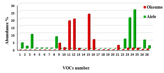 Histogram of the identified volatile compound of aiele and okoume essential oils by GC-MS analysis. The VOC numbers correspond to those used in Table 2.