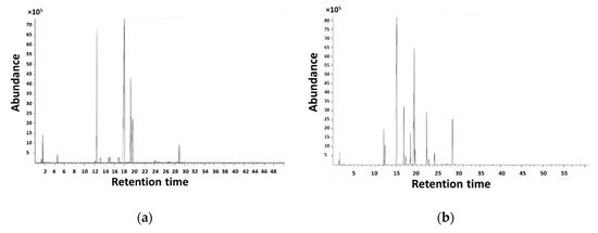 Total ion current (TIC) chromatogram of: (a) okoume and (b) aiele essential oils.