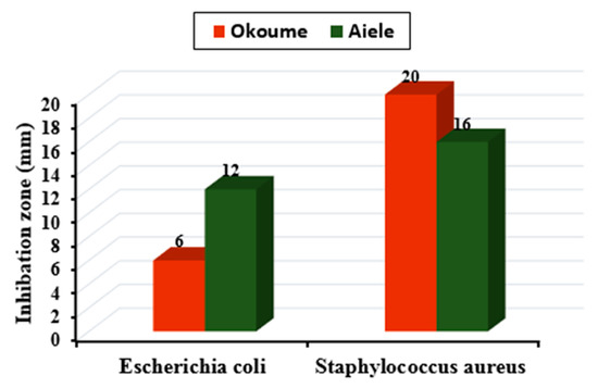 The results of the antibacterial test are summarized in Figure 4. They show that both the essential oil of okoume and aiele have a broad antibacterial activity because they inhibit the growth of Gram+ and Gram− bacteria, producing a zone of inhibition diameter (zdi) of 6 to 12 mm for E. coli and 16 to 20 mm for S. aureus, respectively. According to the results in Figure 4, S. aureus is sensitive to both essential oils. However, the inhibition zone is larger for the oil extracted from Aucoumea klaineana (okoume) than for the oil extracted from Canarium schweinfurthii (aiele). Based on these results, it can be stated that the essential oils showed a clear antimicrobial activity on all strains tested.