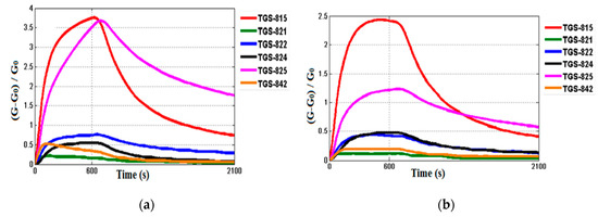 The volatile compounds generated from the essential oil were pumped with a flow rate of 100 mL/min through the measurement chamber containing the sensor array. Upon injecting the sample, data were acquired every 2 s over 10 min. Figure 5 shows typical signals of the normalized conductance of the six TGS gas sensors exposed to the headspace of the two types of essential oils from the same family plants, okoume (Figure 5a) and aiele (Figure 5b). Among the six different gas sensors present in the array, the TGS 815 gas sensor showed the highest response to the two types of essential oils.