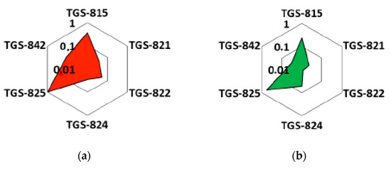 Radar-plots with unitary radius were used to observe whether pattern differences (i.e., fingerprints) developed between essential oil samples. As can be seen, the radar plots (Figure 6) show a clear variation between two essential oils (okoume, aiele). To construct these plots, the values of delta G for the sensor responses were divided by the value corresponding to sensor TGS 825, which showed the maximum signal. This helped to visualize the differences among typical response patterns. Indeed, a clear pattern variation (fingerprint) exists between okoume and aiele, which confirms the ability of the e-nose to easily discriminate between the two types of essential oils using the radar plot representation.