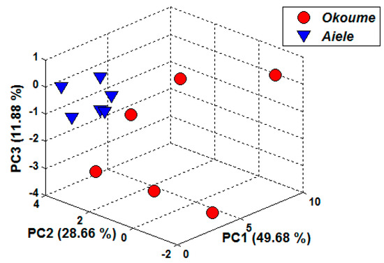 The PCA method was applied as an exploratory technique to study the clustering of data points in the multidimensional dataset. Before approaching the different classification tasks by PCA, it is necessary to reduce the size of the data matrix by selecting variables containing differential information, as the number of variables selected depends on the classification task [60]. In a first step, the data matrix was analyzed using the PCA technique to characterize and discriminate okoume and aiele essential oils. Figure 7 shows the projections of the experimental results on a three-dimensional (3D) graph using the first three new main components. Showing a cumulated variance of the first three principal components explain 49.56%, 28.66%, and 11.88%, respectively (i.e., 90.22%) of the total data variance. From this figure, it can be noticed that the two types of essential oils can be perfectly discriminated by the e-nose in spite of the method uncertainty (i.e., variability within each class) caused mainly by variability in sensor response. On the one hand, the loadings matrix of (PC) was carried out using three features (normalized delta G, slope, and area) multiplied by the six sensors. The score plot is shown in Figure 7. Moreover, the discrimination obtained by the PCA is in good concordance with the specific VOCs that are identified by GC-MS in each essential oil. In particular, okoume essential oils contained some distinctive volatiles (i.e., acetone, toluene, pinenes, and terpenes) that do not appear in the essential oil of aiele. Sensor TGS 822 is quite sensitive to organic solvents such as toluene and acetone and, indeed the response of this sensor to volatiles from okume is significantly higher than for volatiles from aiele (see Figure 6). These differences may explain the discrimination between the two essential oils reached by the e-nose instrument using PCA.
