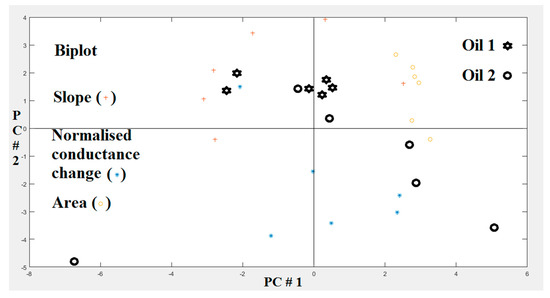 PCA biplot displaying samples of essential oils using conductance change (Delta-G), slope, and area.