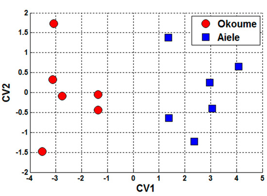 The performance of the e-nose system in the classification of essential oil samples into two groups was evaluated applying DFA method. These groups correspond to those also separated by PCA. Figure 9 shows the DFA performed on two types of essential oils, okoume and aiele. We can see from this figure that all samples are perfectly separated from each other. These results confirm that the e-nose system was able to discriminate different types of essential oils that come from the same family plants.