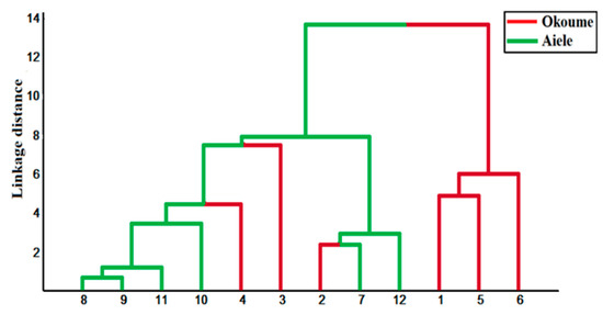 The HCA provides an alternative for the visual representation of high-dimensional data. The results are illustrated in Figure 10 in the form of a dendrogram obtained from the essential oil samples by applying the Euclidean distance and Ward’s link to define the groups. At link. dist = 9, it can be seen that all the samples are grouped into two separate groups, corresponding to the essential oils analyzed. However, samples 2, 3, and 4 belonging to okoume oil are misclassified as aiele oil. The overlaps obtained may be due to the fact that the essential oils possess certain compounds in common according to the results obtained by GC-MS. This proves that the grouping classifications were highly correlated to the GC-MS results. In addition, this result does not contradict the PCA results in which okoume samples show a rather high dispersion in the score plot. Some okoume samples have scores that appear closer to the centroid for aiele, which possibly explains their misclassification by HCA.