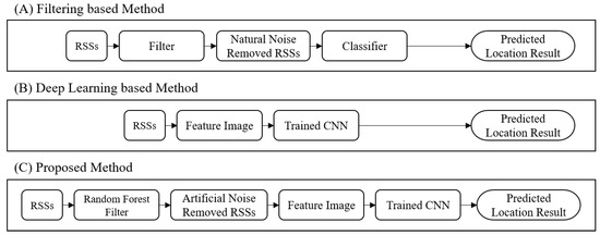 However, Wi-Fi-based indoor localization systems using CSI have the limitation that the existing device driver should be modified. As an alternative, the Wi-Fi-indoor localization systems using raw RSS from WAP have been widely studied [14]. The indoor localization systems using raw RSS are mainly categorized into two groups: (1) filtering-based approach [5,6,7,15,16]; (2) deep learning-based approach [8,9].
