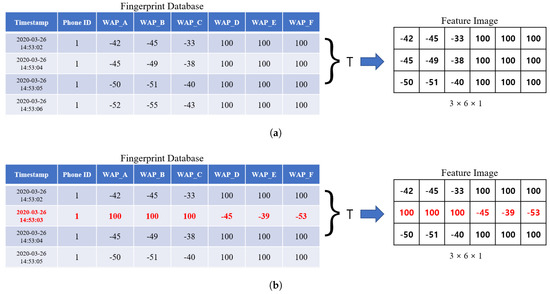 As described in [8], we generate a feature image using T number of RSS tuples with the same phone ID stored in the fingerprint DB for S seconds. For example, let us assume that T is set into 3 and RSS tuples are collected from 6 WAPs. As shown in Figure 3a, three raw time-series RSS tuples with phone ID 1 are used to generate a feature image, whose size is . Using the feature image, we train and test the deep learning-based method.