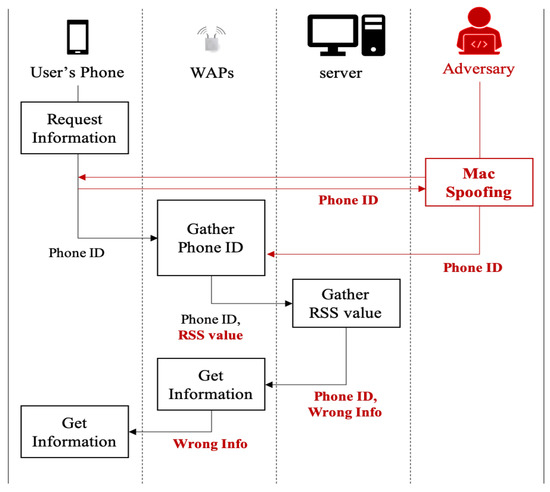 In this paper, we introduce a specific MAC spoofing attack scenario, where the localization accuracy of the state-of-the-art indoor localization methods decreases. In this attack scenario, after spoofing the user’s MAC address, an adversary sends his signal to wireless access points (WAPs) distant from the actual location of the user as if his signal comes from a normal user’s device. As a result, RSS values with the same one as the user’s device ID are captured even at locations where the user device is not actually located. Such results can cause severe budget losses on discount stores which are sensitive to small rearrangement the interior.