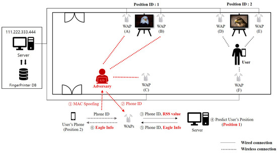 As the user moves to the falcon photo from the eagle photo, the user’s mobile device sends RSSs to the surrounding WAPs (D), (E), and (F). What if the adversary sends the fake RSS data with the disguised user’s device ID to WAPs (A), (B), and (C)? As a result, the user receives information about the eagle, not the falcon, because the indoor localization system on the server returns an abnormal prediction result. To understand the targeted MAC spoofing attack scenario, let us consider an artificial noise injection example through MAC spoofing attack in Figure 5. First, after spoofing the MAC address of the targeted user’s mobile device at position 2, the adversary sniffs and analyzes RSS data from the user’s mobile device (: ①). Second, the adversary sends the fake RSS data with phone ID of the user’s mobile device (: ②). Third, WAPs (A), (B), and (C) nearby the adversary capture RSS. Third, WAPs (A), (B), and (C) send the captured RSS and phone ID to a server (: ③). Fourth, after collecting RSS values from three WAPs and storing in the fingerprint DB, a server predicts position ID 1 matched with the predicted user’s location (: ④). Fifth, a server sends the narrative information related to position ID 1, i.e., eagle information, to the user’s mobile device, not falcon information (: ⑤, ⑥).