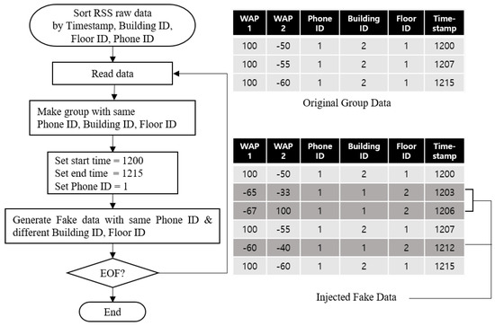 Overall control flow for the artificial noise generation is shown in Figure 6. First, an adversary sorts the collected raw RSS data in ascending order by timestamp, building ID, floor ID, and phone ID. Second, the adversary generates each group data which has the same phone ID, building ID, Floor ID from the sorted data. Third, the adversary sets the start time, the end time and the targeted phone ID. Here, S is set into the end time minus the start time. Finally, the adversary may generate from 0 to 50 the fake RSS data with the targeted phone ID, the different building ID and floor ID. This is because the artificial noise can also be generated from multiple locations within the specific range of signal. As a result, as shown in Figure 6, the fake data is injected into fingerprint DB with the original group data. Therefore, the prediction accuracy of Wi-Fi-based indoor localization systems decreases severely.