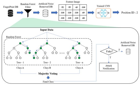 In Figure 7, we show the overall operational procedure of the proposed indoor localization method with RF filtering. In contrast to the deep learning-based methods such as Mai Ibrahim et al.’s method where the original fingerprint DB is used, the modified fingerprint DB where the artificial noise is removed using RF filter is used. When the RSS tuples in the original fingerprint DB are given as the input data of RF, the independent n number of trees are used to classify the given input data. By conducting majority vote for the classified results from every trees, the final class, i.e., ‘fake’ or not ‘fake’, is made. If the final class for a RSS tuple is given into ‘fake’, the RSS tuple is removed and otherwise, the RSS tuple is kept.