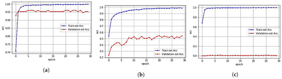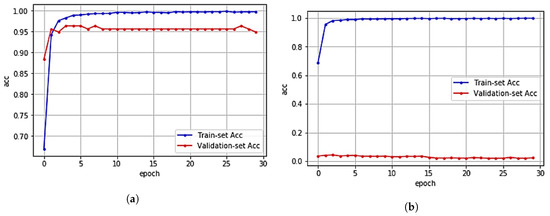 In Figure 8a,b, we show the validation accuracy of CNN model for the original validation dataset and the artificial noise injected dataset, respectively. While the validation results using the original dataset show almost the prediction accuracy by as much as 94.93% on average, the validation results using artificial noise added data show the prediction accuracy by as much as 2.27% on average.