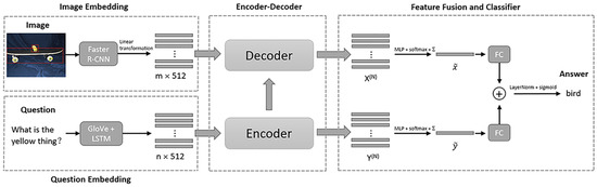 - Chen, C.; Han, D.; Wang, J. Multimodal Encoder-Decoder Attention Networks for Visual Question Answering. IEEE Access 2020, 8, 35662–35671. [Google Scholar] [CrossRef]