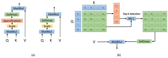 (a) The difference between sparse scaled dot-product attention (left) and ordinary dot-product attention (right). (b) The core calculation steps of sparse scaled dot-product attention. Through explicit selection based on top-k selection and softmax function, only the most contributive elements are assigned with probabilities.