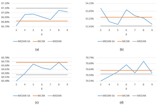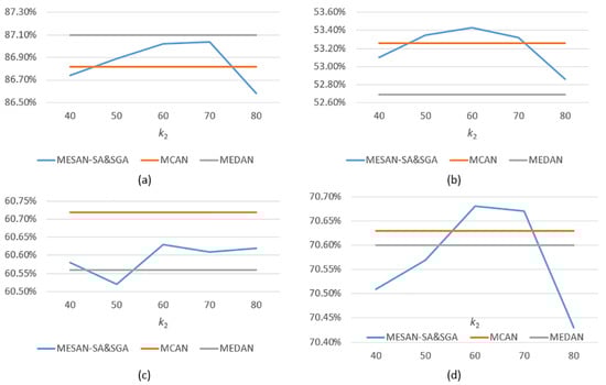 (a) The Yes/No accuracy of MCAN, MEDAN, and MESAN-SA with different k. (b) The Number accuracy of MCAN, MEDAN, and MESAN-SA with different k. (c) The Other accuracy of MCAN, MEDAN, and MESAN-SA with different k. (d) The Overall accuracy of MCAN, MEDAN, and MESAN-SA with different k. All the reported results are evaluated on VQA v2 test-dev set.