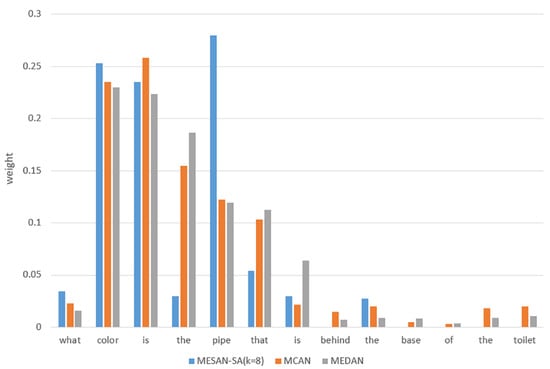 The visualization results of the attention of MESAN-SA(k = 8), MCAN, and MEDAN for a specific question. The ordinate is the weight to measure the importance of a word.