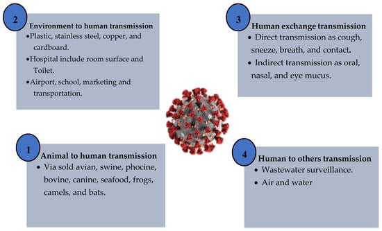 | Human to others | Low | Wastewater surveillance | 18 April 2020 | Australia | SARS-CoV-2 | [76,78] |