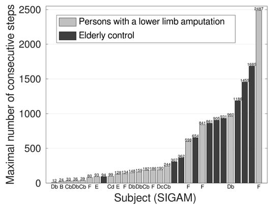 Maximal numbers of consecutive steps of each subject. The SIGAM mobility grade is given for every subject of the persons with a lower limb amputation. B = Therapeutic use only for transfers, C = Walks on level ground less than or equal to 50 m with (Cb)/without aids (Cd), D = Walks outdoor on level ground only, in good weather, more than 50 m with 2 crutches/sticks (Db) or 1 crutch/stick (Dc), and E = Walks more than 50 m, no aids, except in adverse terrain or weather, F = normal or near normal gait.