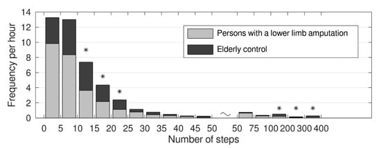 In addition to the number of consecutive steps within each walking bout, we were interested in the frequency of walking bouts per hour. Therefore, categories of walking bouts were created in bins of 5 steps (for the walking bouts in which 0 to 50 consecutive steps were walked), bins of 25 steps (from 50–100 consecutive steps), and bins of 100 steps (from 100–400 consecutive steps). These frequencies were determined for both the persons with a lower limb amputation and the elderly control group.