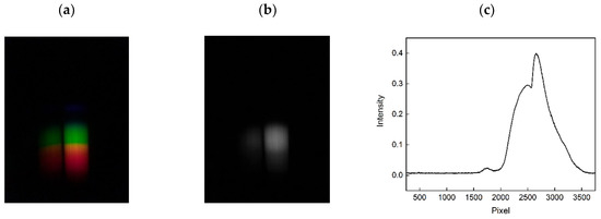 An example of an obtained photo image of the sensor system as well as the subsequent grey-scaling and determination of the sensor spectrum by calculating the average intensity values over neighbouring columns is illustrated in Figure 3. The measured sensor spectra are shown for the two adjacent optical waveguides of the polymer sensor chip in Figure 3a,b after the subsequent grey-scaling. As illustrated, the measured intensity spectrum of the first (left) waveguide is lower than that of the second (right) waveguide (see Figure 2a). The lower intensity of the first waveguide is due to the smaller waveguide bend. Therefore, the second waveguide was applied for the investigation of 25OHD detection. Moreover, after the grey scaling, the intensity distribution per column was calculated to obtain the sensor spectrum (Figure 3c). While the second waveguide was not used in the present study, it should be noted that after further optimization of the sensor design, several waveguides can be implemented in one sensor system which paves way for multiplexing applications in the future.
