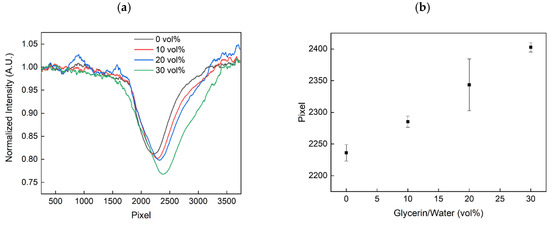 As illustrated in Figure 4, the SPR spectra could be measured and thus the response for increasing glycerin solutions, i.e., spectral shift, was obtained. The shift towards higher pixel numbers corresponds to a shift of the SPR towards higher wavelengths due to increasing refractive indices of the environment. These results agree well with our previously reported measurements from an SPR biosensor based on a polymer multi-mode optical waveguide [17], which indicated an SPR at 560 nm (n = 1.33) and a redshift of the SPR due to increasing refractive index solutions. Moreover, since no polarization filters were applied, only part of the guided light within the optical waveguide structure can couple to the surface plasmons. With the current configuration, a sensitivity of 5.67 pixels/vol% or 206.63 pixels/RIU (refractive index units) was achieved with a standard deviation of 12.79 pixels (0 vol%), 8.98 pixels (10 vol%), 40.84 pixels (20 vol%), and 7.34 pixels (40 vol%) and thus a Limit of Detection (LOD) of 0.19 RIU.