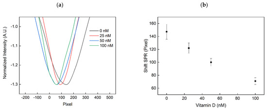 The developed sensor and assay were investigated by measuring sensor response after incubation with different concentrations of 25OHD in 10% human serum. The SPR was measured before and after the sensing of 25OHD using water (n = 1.33) as a reference buffer. The obtained shift of the SPR is illustrated in Figure 6. Since a new sensor was applied for every vitamin D concentration (0 nM, 25 nM, 50 nM and 100 nM), the measured SPR spectrum was standardised to the reference measurement, i.e., the difference between the determined positions of “centre of mass” of SPR sensor spectra before and after immobilization was calculated for each sensor. Moreover, three measurements were performed for every vitamin D concentration. As depicted in Figure 6b, a sensitivity of –0.752 pixel/nM was obtained with a standard deviation of 8.05 pixel. The decrease in the SPR wavelength can be explained by the decrease of AuNPs that are immobilised on the gold surface of the SPR sensor, due to the increase in binding of the vitamin D molecule to the aptamers and thus decreased hybridization of the oligonucleotide (Figure 4). The sensor was capable of detecting 25 nM 25OHD in solution. As the desirable range of 25OHD in serum ranges from 50–100 nM [24], the sensing was successfully demonstrated for physiologically relevant concentrations.