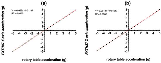The R2 value of the linear regression analysis for the X and Z-axis acceleration was 0.9985 and 0.9966, respectively (Figure 11). The average standard deviation of the acceleration values for all the intervals combined was ±0.10 g for X-axis acceleration and ±0.15 g for Z-axis acceleration.