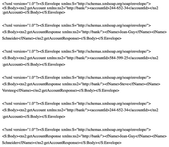 The first banking data set contains 300 traces; each trace may contain the interactions related to one out of 10 account IDs. Each trace length varies between three and eight messages. The data set has 1141 pairs of request and corresponding response messages. This data set includes six types of request messages. Each trace is started with and ended with . Therefore, these message types appear exactly once in each trace. Then, [0–8] instances of messages of types , , and can be found. Here, the first banking data set samples are shown in Figure 5.