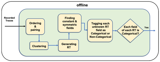 This module works in the offline mode and consists of several components. Thus, the messages are ready for the categorical module [24]. Figure 3 shows that the preprocessing module starts with ordering and pairing component, which assigns an order to the recorded messages by adding an additional key and value such as <messageID,V> to each message in ascending order by using the recorded time. This component also pairs each response and its corresponding request message; this pair is considered an interaction. To generate RT for each request message type, the component initially clusters interactions on the basis of their request message types. Then, in generating RT component a request and a response template out of all request and response message keys for each cluster are generated using the union of all sets of request and response keys. Subsequently, in finding constant and symmetric field component, CSV identifies constant fields, which carry one distinct value across all the messages of the cluster and symmetric fields that contain equal values in each cluster’s request and corresponding response in each RT. It fills the RT with the constant and symmetric values given their availability.