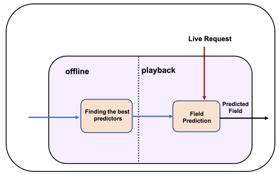 Field prediction component is conducted in playback mode. Playback mode is when the live request comes and the virtual service is expected to respond as the representative of the actual service. On the basis of the generated RT, the categorical fields and their predictors, the system finds the values of the categorical fields using the field prediction component, combines the predicted values in its RT, and sends it as the live response. This component utilises the predictors from the offline mode to generate the value of the categorical field for the incoming live request messages. As shown in Figure 4, to generate each categorical response field, the values of the predictor fields from the live request are used to generate the unknown categorical field. This component uses the identified predictors to find the value for the unknown categorical field with the highest co-occurrence or joint probability with the predictor field values in the recorded traces. To find such a value, the method uses the joint probability distribution of request and response fields using Equation (2) of the training set. The best predictors are used, and the categorical target value may result in more than one value for a particular field. Therefore, the value, which appears in the messages with higher messageID, is selected because the message with a higher message messageID is more recent.