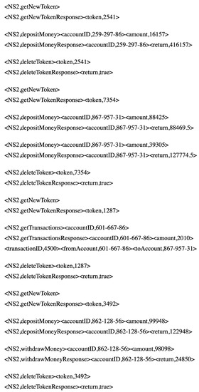 The banking data set comprises network interactions between an ATM and the banking server using SOAP protocol. To test the ATM service, the banking server needs to be virtualised in such a way that it mimics the real logic and behaviour of the banking server without any knowledge of the protocol or the servers’ behaviour. In an actual scenario, ATM needs to communicate with the server, deposit to, withdraw from and obtain the balance values and account information of the specific bank account by using different message types.